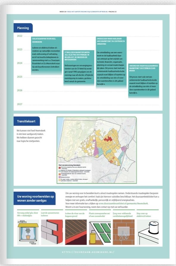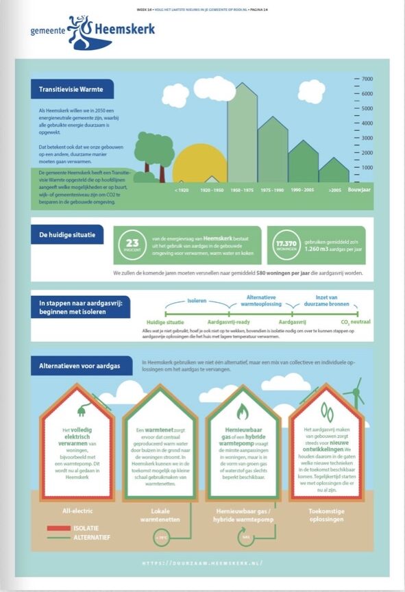 Alle gemeenten in Nederland moeten dit jaar een visie vaststellen hoe men stappen wil zetten om in uiterlijk 2050 helemaal van het aardgas af te zijn vanwege het klimaatprobleem. Dit heet de Transitievisie Warmte (TVW). De eerste TVW richt zich overigens vooral op de periode tot 2030.  Het college van Burgemeester & Wethouders heeft vorige week de Heemskerkse TVW vastgesteld. Daar is onder leiding van een adviesbureau ongeveer een jaar aan gewerkt. Individuele burgers, Gemeenteraadsleden en organisaties als HVC, WoonOpMaat, Liander, het waterschap en ook EcoHeemskerk hebben meegedacht.