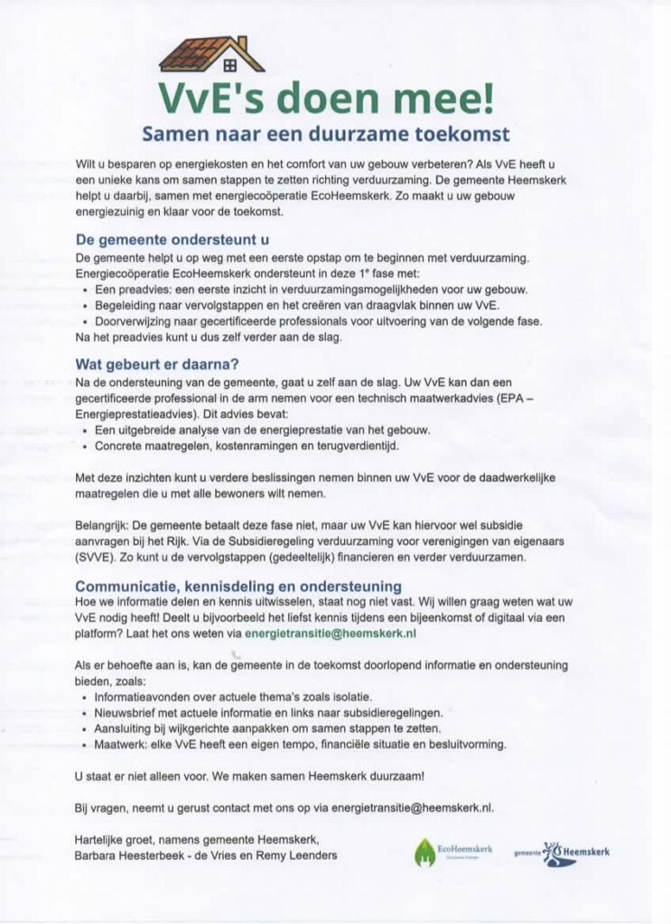 Al met al een geslaagde avond, die mogelijk volgend jaar nog een keer wordt herhaald! En als u als VvE-bestuur en VvE-bewoner nog vragen heeft over het voorgaande, stuur dan een e-mail naar de gemeente: energietransitie@heemskerk.nl of naar ons: info@ecoheemskerk.nl
