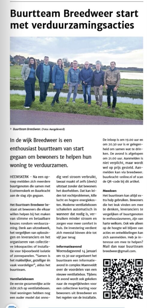 Met steun van de organisatie Buurkracht, EcoHeemskerk en de gemeente is in Breedweer sinds kort een zogeheten Buurtteam actief dat nadenkt over een collectieve actie in de wijk om energie te besparen. De eerste actie richt zich op ventilatieboxen. Veel woningen in Breedweer hebben nog een ouder model dat onnodig veel stroom gebruikt, lawaai maakt of zelfs (deels) uit staat zonder dat de bewoners het doorhebben. Dit kan leiden tot vochtproblemen, kille lucht en hogere energiekosten.