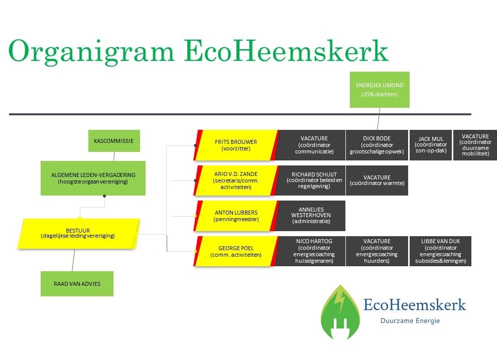 Medio 2019 is ook in Heemskerk een energiecoöperatie opgericht, EcoHeemskerk geheten. Juridisch is EcoHeemskerk een coöperatieve vereniging U.A. (met Uitgesloten Aansprakelijkheid), met leden en een bestuur. De bestuursleden stellen zich hieronder voor.